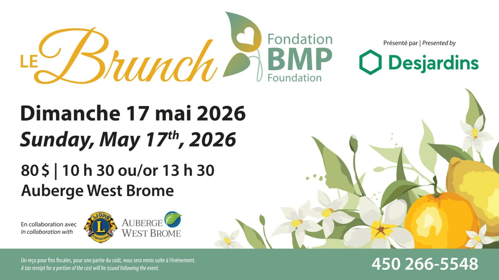 La Fondation BMP, en collaboration avec l’Auberge West Brome et le Club Lions de Knowlton, est ravie d’organiser la 35e édition de son brunch annuel.