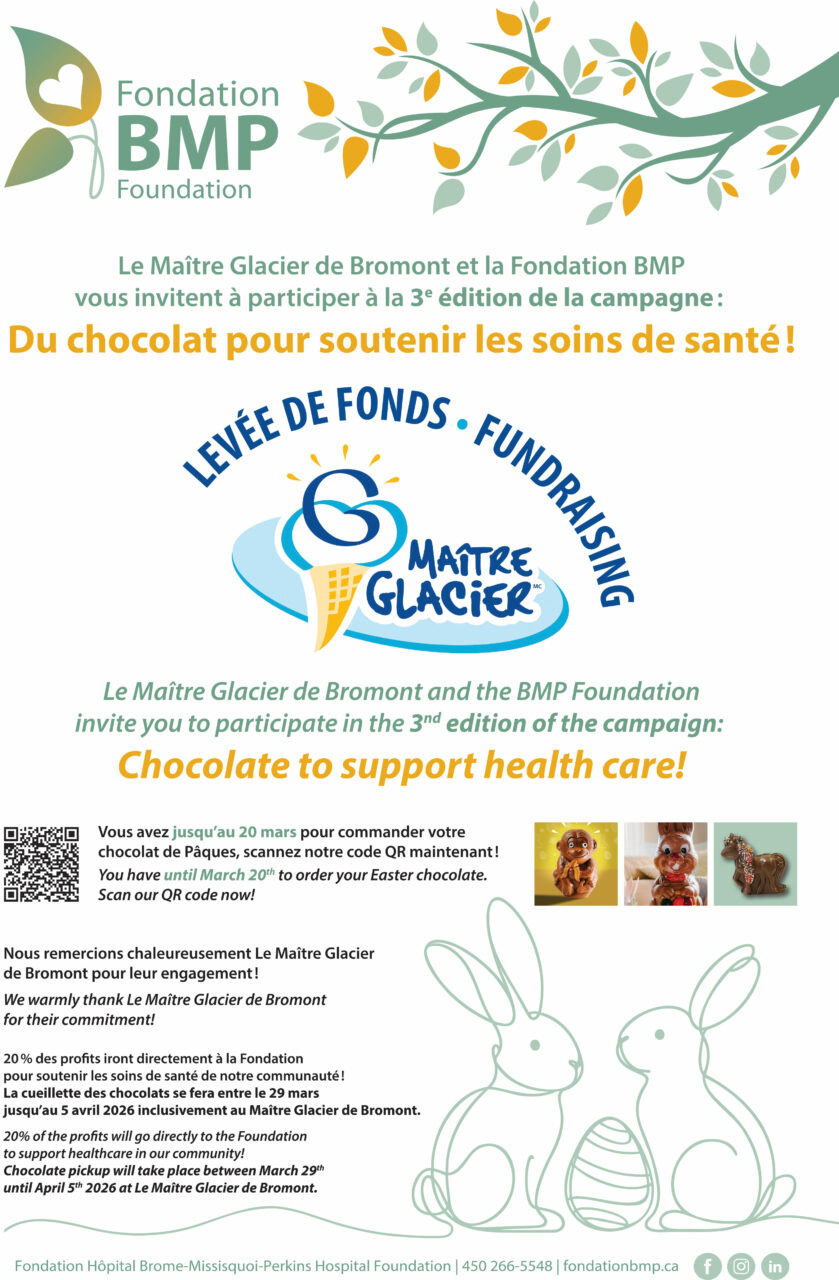 La Fondation BMP et le Maître Glacier vous invitent à participer à la 3ᵉ édition de sa campagne Du chocolat pour soutenir les soins de santé! 20% des profits iront directement à la Fondation BMP pour soutenir les soins de santé de notre communauté. Vous avez jusqu’au 20 mars pour commander vos chocolats de Pâques! La cueillette se fera entre le 29 mars et le 5 avril inclusivement au Maître Glacier de Bromont.